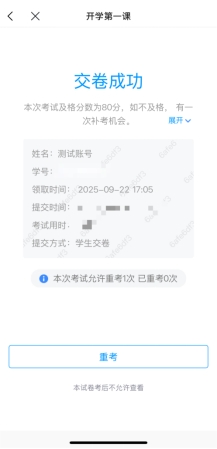 ·若成绩不合格,可点击【重考】重新参加考试,每位同学重考机会为3次。