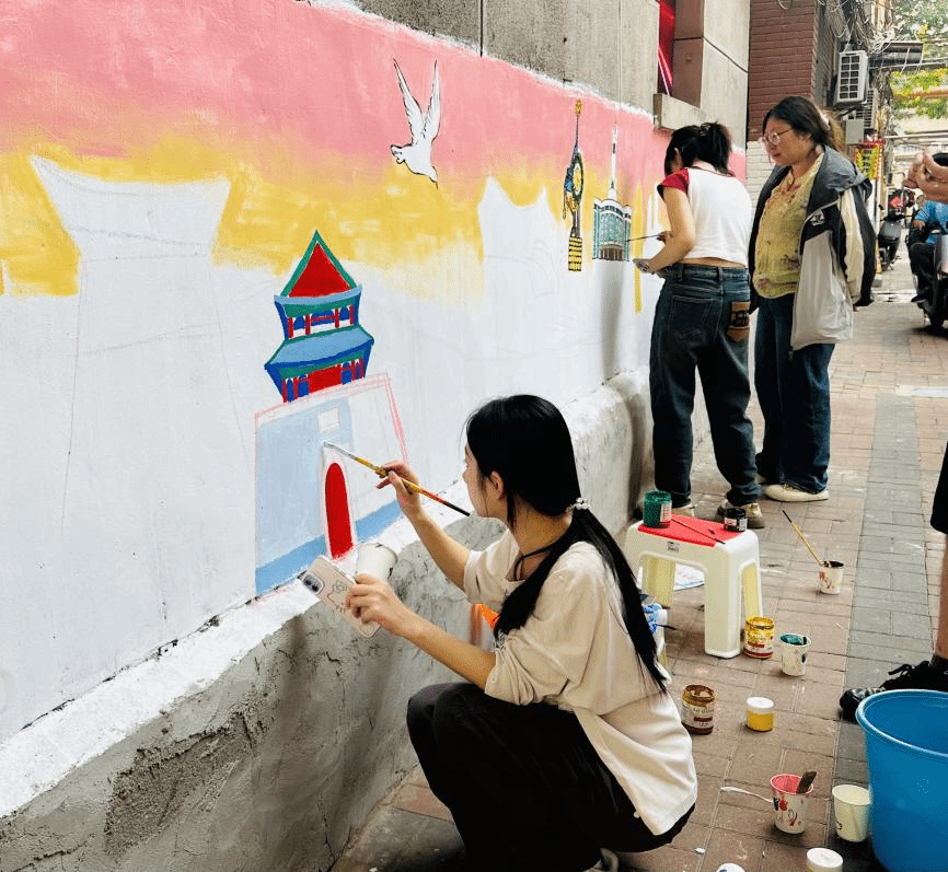 为庆祝中华人民共和国成立76周年与中秋佳节,中国画学院组织学生走进天津市和平区兆丰路社区开展“绘地标·庆双节”墙绘志愿服务活动,以艺术创作传递家国情怀,用志愿服务诠释青春担当,在笔墨丹青间勾勒节日祝福与城市记忆。此次活动以墙绘为桥梁,将专业艺术实践与志愿服务相结合,既让天美国画学子在创作中深化了对家国文化与城市历史的理解,又为社区营造了浓厚的双节氛围,用青春笔触书写了新时代青年的责任与担当。